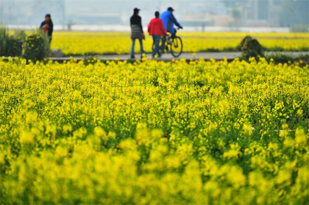 的光芒与翠绿的茎叶交相辉映,成群结队的蜜蜂、蝴蝶在花丛中嬉戏,三五成群的游客在花海中拍照打卡,共同绘就了